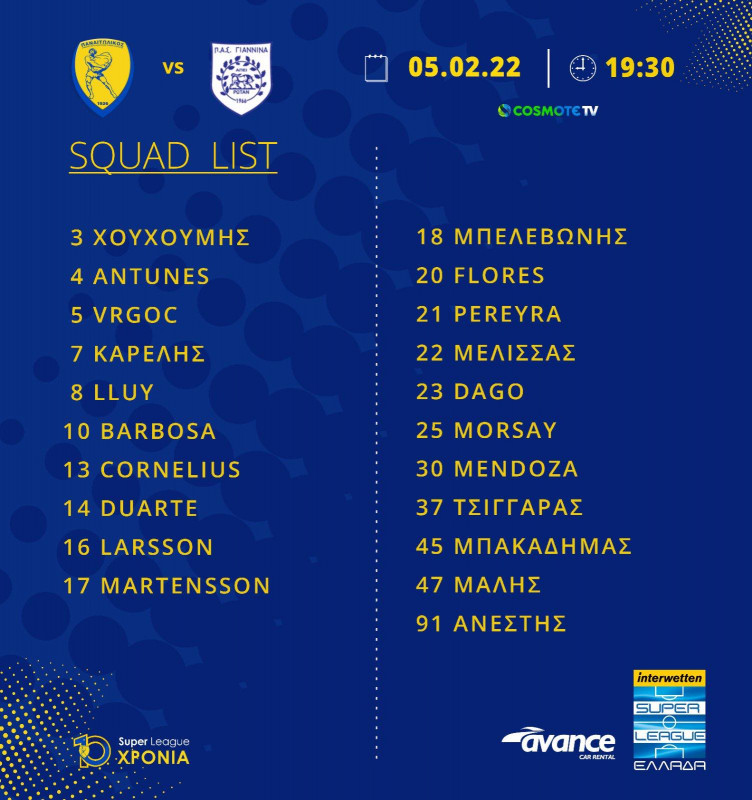 Στην αποστολή του αγώνα με τον ΠΑΣ Γιάννενα συμμετέχουν οι ποδοσφαιριστές: