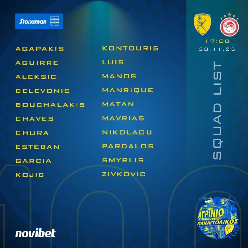Στην αποστολή του αγώνα με τον Ολυμπιακό συμμετέχουν οι Ποδοσφαιριστές: