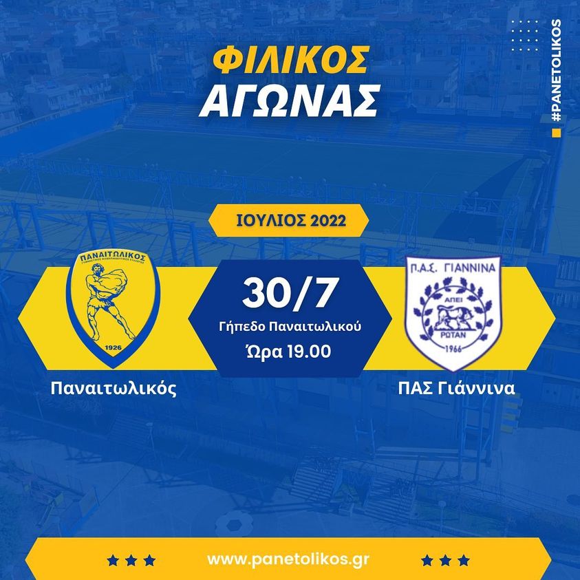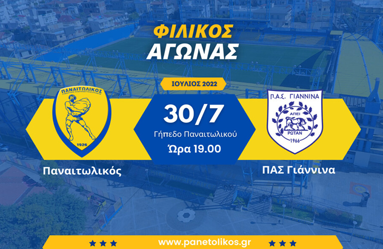 Το Σάββατο 30 Ιουλίου (ώρα 19.00) η ομάδα μας δίνει τον πρώτο φιλικό αγώνα στο γήπεδο Παναιτωλικού με αντίπαλο τον ΠΑΣ Γιάννινα, στο πλαίσιο της καλοκαιρινής προετοιμασίας της.