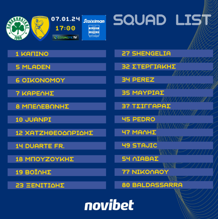 Στην αποστολή του αυριανού (Κυριακή, 7/1 στις 17:00) εκτός έδρας αγώνα με τον Παναθηναϊκό συμμετέχουν οι Ποδοσφαιριστές: