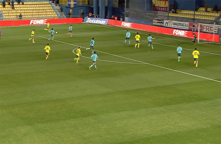 Εκτέλεσε ο Σενγκέλια, η μπάλα πέρασε από όλους και στην συνέχεια άουτ.