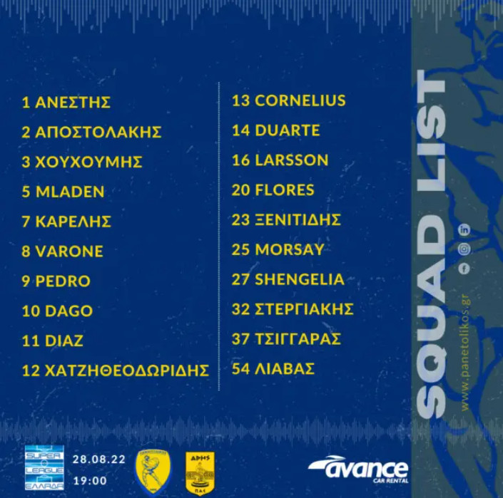 Στην αποστολή του αγώνα Πρωταθλήματος Super League με αντίπαλο τον Άρη συμμετέχουν οι Ποδοσφαιριστές: