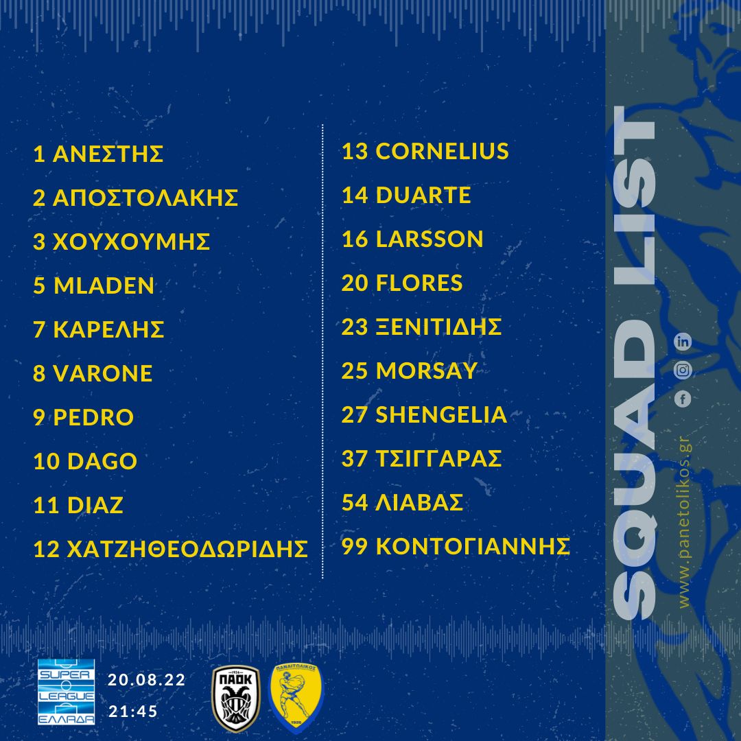 Στην αποστολή του πρώτου αγώνα Πρωταθλήματος Super League 2022-2023 με αντίπαλο τον Π.Α.Ο.Κ. συμμετέχουν οι Ποδοσφαιριστές: