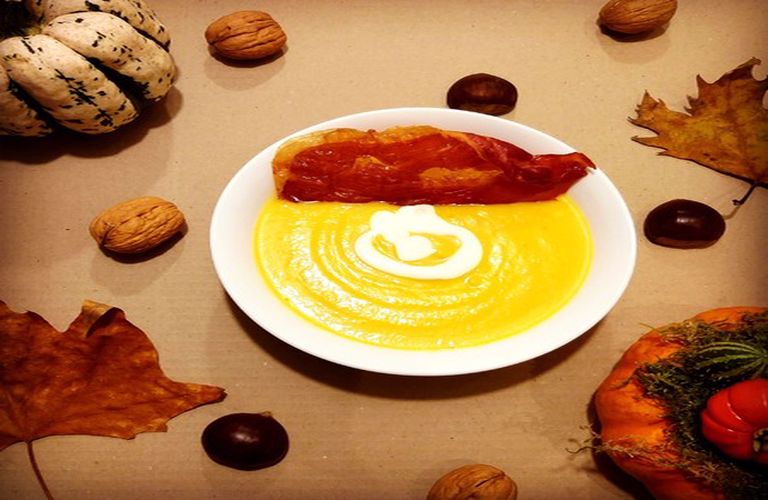 Σούπα βελουτέ γλυκιάς κολοκύθας με τραγανό προσούτο
