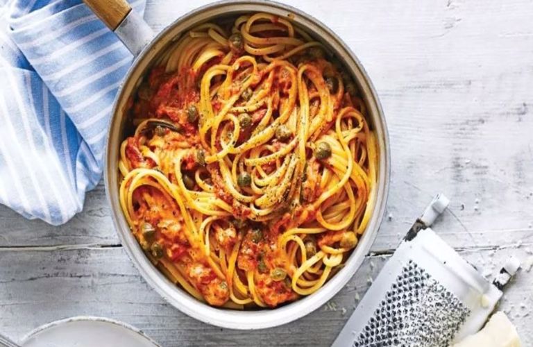 Ρίχνουμε και την κάππαρη που έχουμε ξεπλύνει σε νερό και έχουμε στραγγίξει καλά. Μεταφέρουμε στο τηγάνι τα σπαγγέτι που βράσαμε χωρίς να τα στραγγίξουμε. Το νερό από το βράσιμο θα βοηθήσει να δέσει ακόμη πιο ωραία η σαλτσούλα μας. Ανακατεύουμε καλά. Σερβίρουμε τη μακαρονάδα μας με τριμμένο τυρί και την απολαμβάνουμε όσο είναι ζεστή.