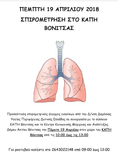 Την Πέμπτη 19 Απριλίου στον χώρο του ΚΑΠΗ Βόνιτσας στην Βόνιτσα θα γίνει σπιρομετρικός έλεγχος για ενήλικες από τις 10:00 έως τις 13:00. Κατά τη διάρκεια της εξέτασης θα γίνεται σπιρομέτρηση σε δύο σπιρόμετρα.