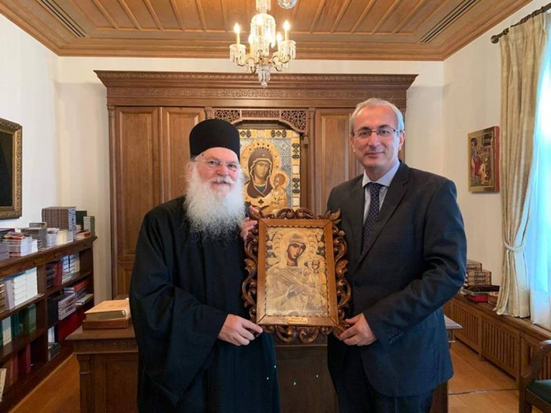 Στην Ιερά Μονή Βατοπεδίου δέχθηκε σήμερα ο Καθηγούμενος της Ιεράς Μονής π.Εφραίμ τον Δήμαρχο Θέρμου, Σπύρο Κωνσταντάρα, με τον δεύτερο να παραδίδει εικόνα της Παναγίας Προυσιωτίσσης εκ των χειρών Θεοφάνη Σιάχου.
