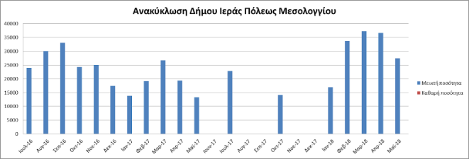 Ο μέσος όρος σύμμεικτης ποσότητας ανακυκλώσιμων από τον Ιούλιο 2016 έως τον Δεκέμβριο 2017 ήταν 21 τόνοι το μήνα. Ο μέσος όρος από τον Ιανουάριο 2018 έως και το Μάιο 2018 (εκκρεμούν δύο δρομολόγια του Μαΐου τουλάχιστον) είναι 30 τόνοι.