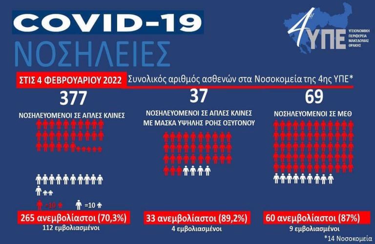 Συγκεκριμένα όσον αφορά τις απλές κλίνες 14 νοσοκομείων της 4ης ΥΠΕ, οι ανεμβολίαστοι ασθενείς ανέρχονται στους 265 (ποσοστό 70,3%), ενώ οι εμβολιασμένοι τους 112.