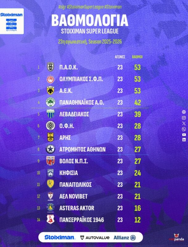 Και οι 14 ομάδες στη Stoiximan SL1 συμπλήρωσαν τις 23 Αγωνιστικές και φυσικά ο Π.Α.Ο.Κ. επέστρεψε στην κορυφή, την ίδια ώρα ο Παναιτωλικός είναι στην 11η θέση.
