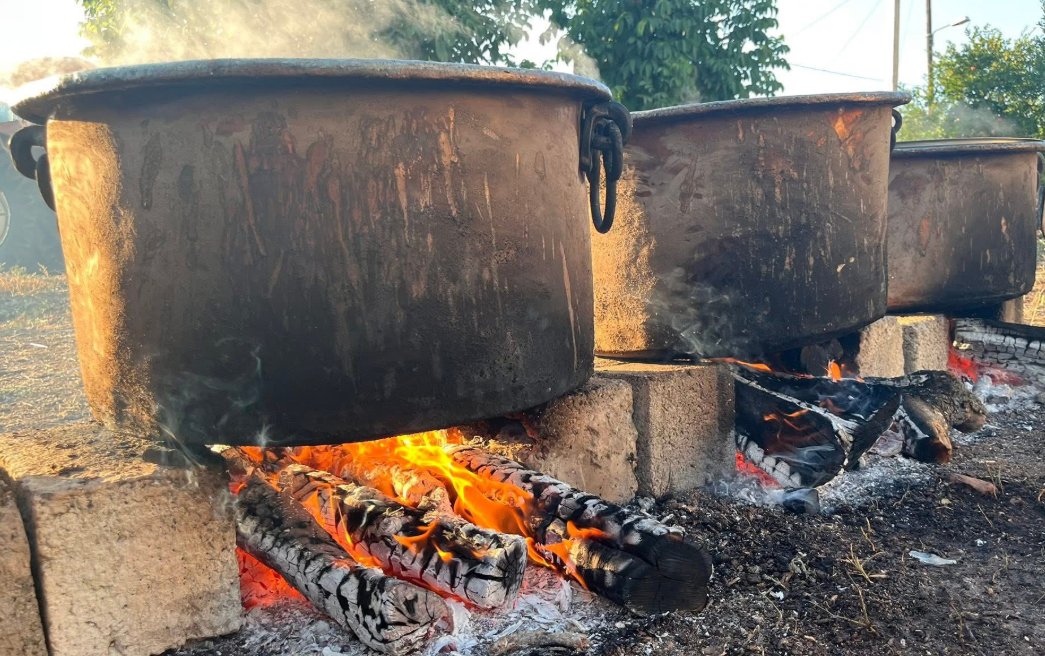 Ο Σύλλογος Στρογγυλοβουνιωτών μαγείρεψε το καθιερωμένο φαγητό – κρέας με μακαρόνια βρασμένα στα καζάνια – και το πρόσφερε δωρεάν στους παρευρισκόμενους.