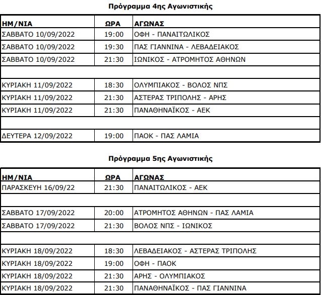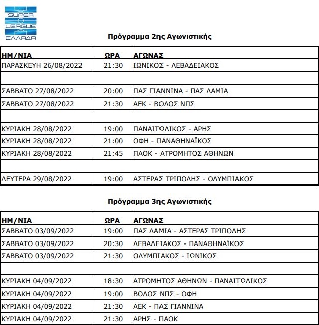 Λίγες ώρες πριν τη σέντρα στη Super League με το Βόλος-Αστέρας Τρίπολης στο Πανθεσσαλικό, η διοργανώτρια αρχή ανακοίνωσε το αναλυτικό πρόγραμμα του πρωταθλήματος από τη 2η έως και την 5η αγωνιστική! Ουσιαστικά, δηλαδή, έβγαλε πρόγραμμα μέχρι και τη διακοπή για τις εθνικές ομάδες.