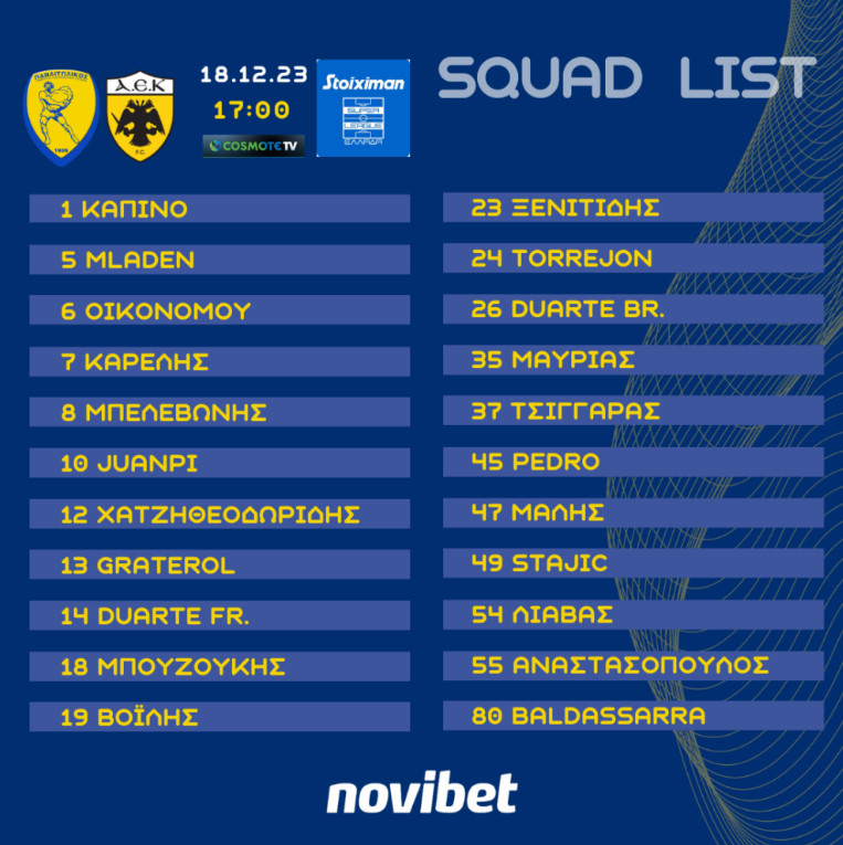 Στην αποστολή του αυριανού (18/12) αγώνα με την Α.Ε.Κ. συμμετέχουν οι Ποδοσφαιριστές: