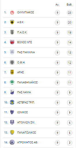 Μεγάλο ενδιαφέρον παρουσιάζει το Πρωτάθλημα και στις πρώτες θέσεις της Βαθμολογίας με τον Ολυμπιακό να είναι στην κορυφή και τους Α.Ε.Κ. και Π.Α.Ο.Κ. να ακολουθούν με τους Βόλο και Π.Α.Σ. Γιάννινα να συμπληρώνουν την πρώτη πεντάδα.