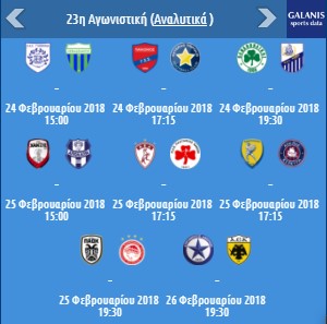 Την Κυριακή 18 Φεβρουαρίου, ο Ολυμπιακός κέρδισε με σκορ 1-0 τον Πανιώνιο στο «Γ. Καραϊσκάκης», ο Παναιτωλικός έφυγε με το διπλό (1-2) από την έδρα του Λεβαδειακού, η Α.Ε.Κ. επικράτησε με 4-0 επί της Ξάνθης στο Ο.Α.Κ.Α. ενώ ο ΠΑΣ Γιάννινα επιβλήθηκε με 3-0 επί του Πλατανιά στα Χανιά.