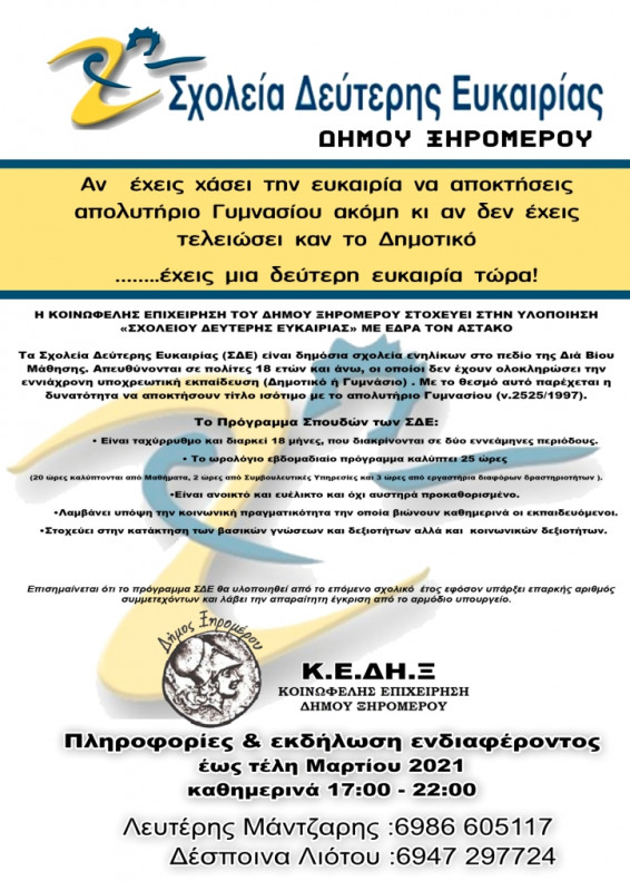 Με επίσημο έγγραφο του Υπουργείου Παιδείας και Θρησκευμάτων (Υ.ΠΑΙ.Θ) που αναρτήθηκε σήμερα στο ΔΙΑΥΓΕΙΑ, η προσπάθεια που ξεκίνησε από το 2020 της Κοινωφελούς Επιχείρησης του Δήμου Ξηρομέρου, για ίδρυση Σχολείου Δεύτερης Ευκαιρίας (Σ.Δ.Ε), ευοδόθηκε και το αίτημα εγκρίθηκε.
