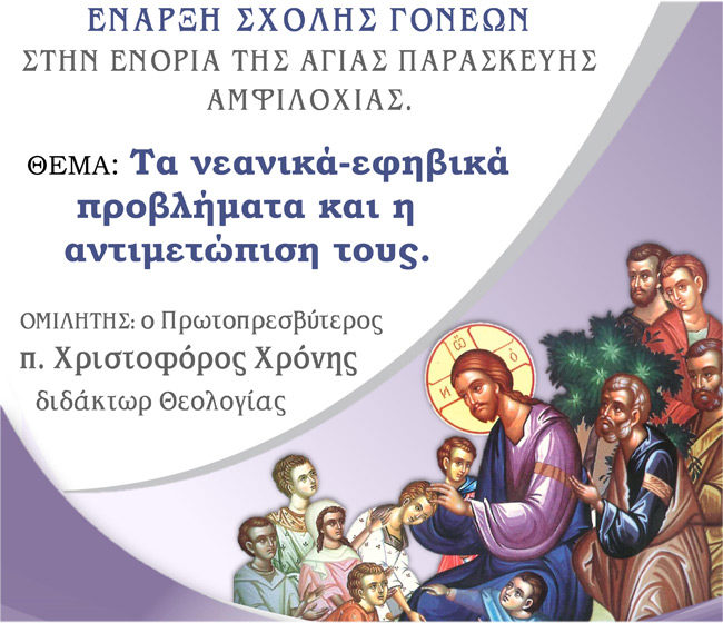 Η Ενορία Αγίας Παρασκευής Αμφιλοχίας ξεκινάει τις Συνάξεις νέων-σχολή γονέων και προσκαλεί όλους τους γονείς την: Τετάρτη 30 Οκτωβρίου και ώρα 6:30 μ.μ στον πνευματικό κέντρο της ενορίας, με θέμα ομιλίας «ΤΑ ΝΕΑΝΙΚΑ ΚΑΙ ΕΦΗΒΙΚΑ ΠΡΟΒΛΗΜΑΤΑ ΚΑΙ ΟΙ ΑΝΤΙΜΕΤΩΠΙΣΗ ΤΟΥΣ»