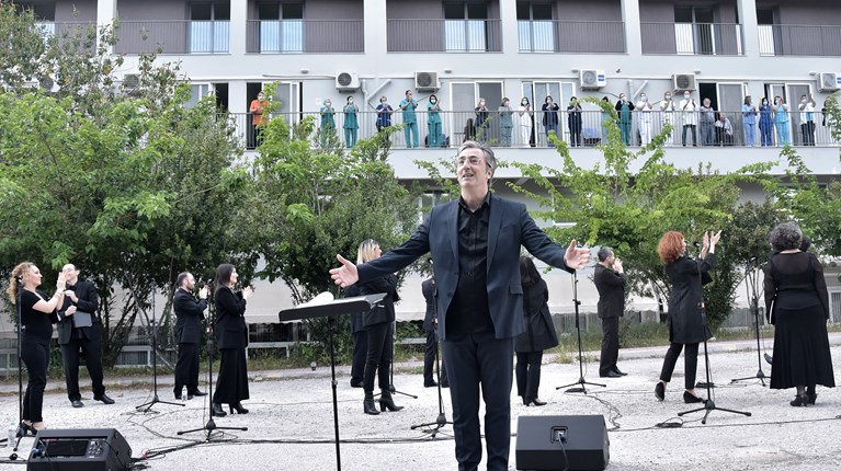 Με τη συναυλία της Χορωδίας της ΕΡΤ στον υπαίθριο χώρο του Ασκληπιείου Βούλας συνεχίστηκε σήμερα, Σάββατο 2 Μαΐου η δράση των Μουσικών Συνόλων της ΕΡΤ για τη στήριξη του ιατρικού και νοσηλευτικού προσωπικού στα νοσοκομεία αναφοράς, αλλά και τους συμπολίτες μας που νοσηλεύονται σε αυτά χτυπημένοι από τον κορονοϊό.