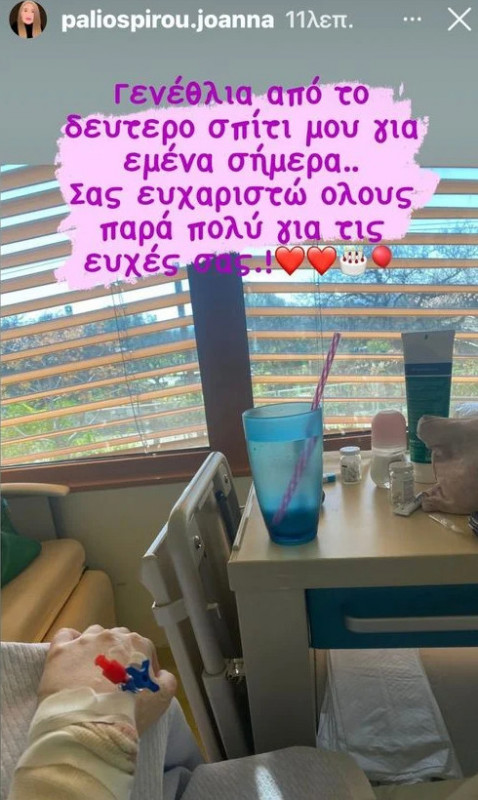 Συγκεκριμένα, η Ιωάννα Παλιοσπύρου ανήρτησε μία φωτογραφία μέσα από το νοσοκομείο και τη συνόδευσε γράφοντας: «Γενέθλια από το δεύτερο σπίτι μου για εμένα σήμερα. Σας ευχαριστώ όλους πάρα πολύ για τις ευχές σας».