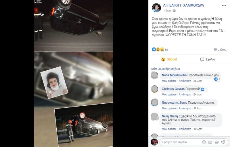 Αναλυτικά το συγκλονιστικό μήνυμα της ίδιας: Όσα φέρνει η ώρα δεν τα φέρνει ο χρόνος! Η ζώνη μου έσωσε τη ζωή! Οι Άγιοι Πάντες φρόντισαν να βγω αλώβητη! Το ενδιαφέρον όλων σας συγκινητικό. Είμαι καλά και μένω προληπτικά στο Γ.Ν. Αγρινίου. ΦΟΡΕΣΤΕ ΤΗ ΖΩΝΗ ΣΑΣ!!!!