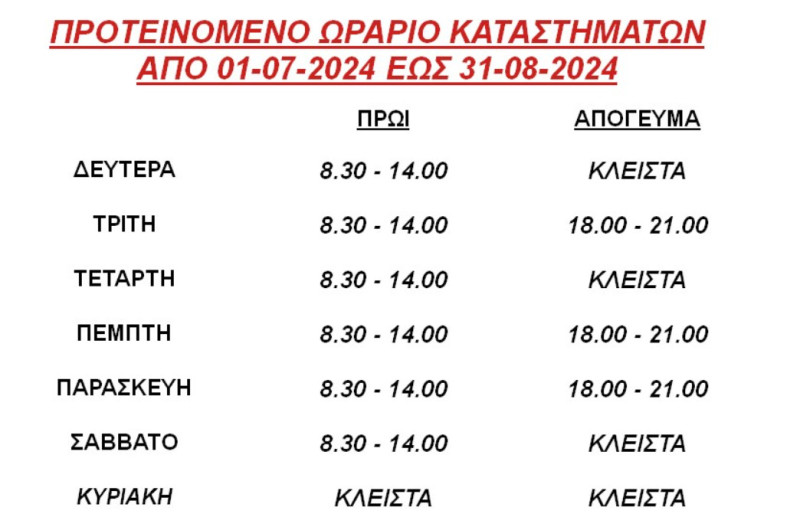 Ο Σύλλογος Εμπόρων και Επιχειρηματιών Αγρινίου προτείνει σε ό,τι αφορά το θερινό ωράριο λειτουργίας ξεκαθαρίζει πως τα καταστήματα θα παραμείνουν ανοιχτά όλα τα Σάββατα τόσο τον Ιούλιο, όσο και τον Αύγουστο.