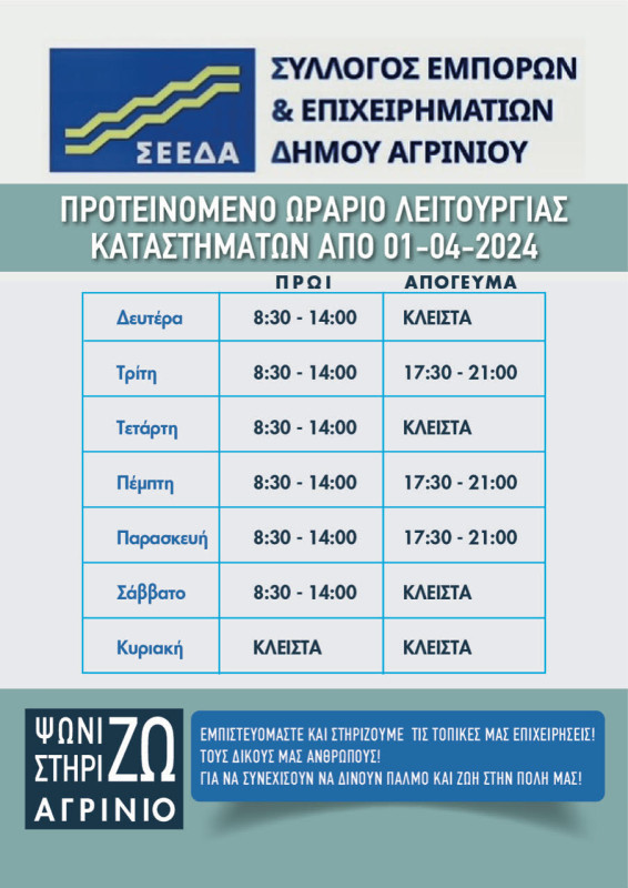 Ο Σύλλογος των Εμπόρων και Επιχειρηματιών του Δήμου Αγρινίου (Σ.Ε.Ε.Δ.Α.) δημοσιοποίησε το ωράριο που προτείνει για τα εμπορικά καταστήματα με ισχύ από την 1η Απριλίου.