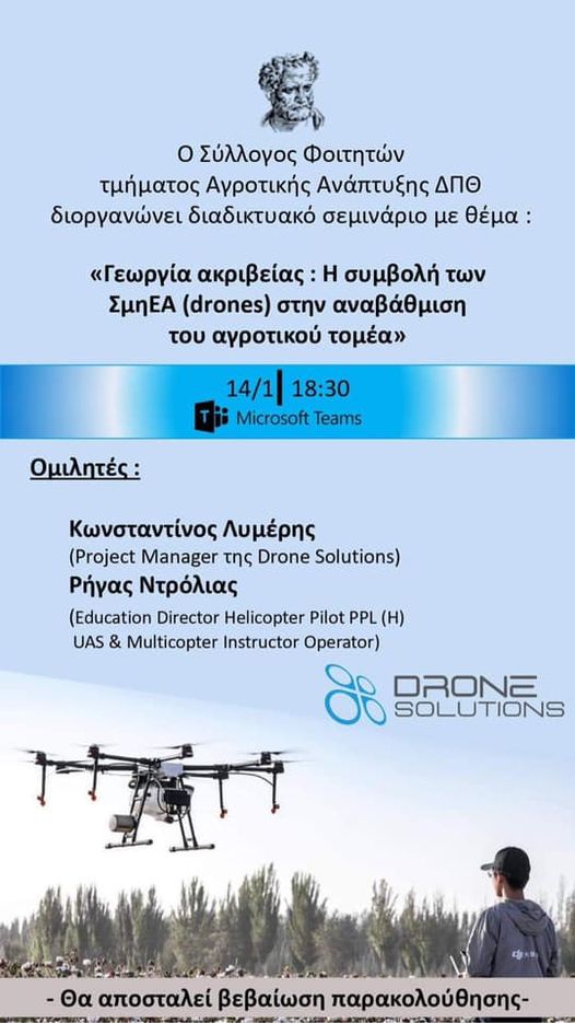 «Η συμβολή των ΣμηΕΑ (drones) στην αναβάθμιση του αγροτικού τομέα», την Πέμπτη 14 Ιανουαρίου 2021 και ώρα 18.30 μέσω της ψηφιακής πλατφόρμας MS TEAMS και του παρακάτω συνδέσμου.