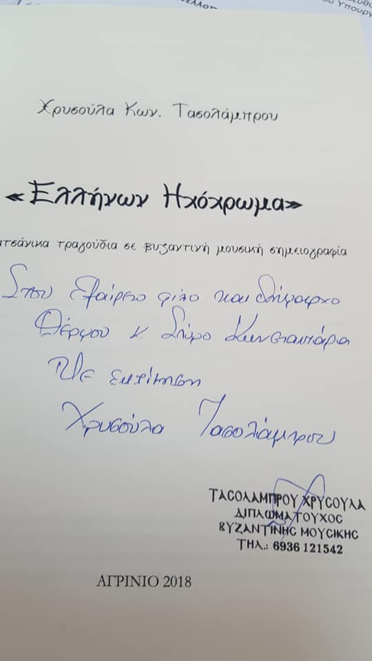 Με χαρά δέχθηκε σήμερα στην Δημοτική Βιβλιοθήκη Θέρμου ο Δήμαρχος Θέρμου, Σπύρος Κωνσταντάρας, την διπλωματούχο Βυζαντινής Μουσικής κ Χρυσούλα Τασολάμπρου, η οποία δώρησε βιβλία της υπό τον τίτλο “Ελλήνων Ηχόχρωμα” και με την χορωδία της “Αγίας Σκέπης” θα κάνει την έναρξη των φετινών εκδηλώσεων του Αγίου Κοσμά στις 16/8/2019 στο προαύλιο του Ιερού Ναού Κοιμήσεως Θεοτόκου Θέρμου.