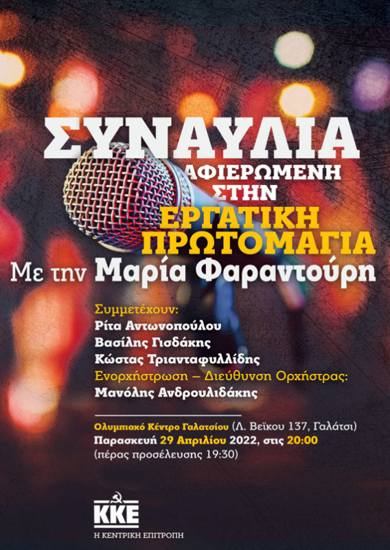 Η Κεντρική Επιτροπή του Κ.Κ.Ε., για να τιμήσει την Εργατική Πρωτομαγιά, διοργανώνει μεγάλη συναυλία με τη Μαρία Φαραντούρη την Παρασκευή 29 Απριλίου στις 20:00, στο Ολυμπιακό Κέντρο Γαλατσίου (Λεωφ. Βεϊκου 137, Γαλάτσι).