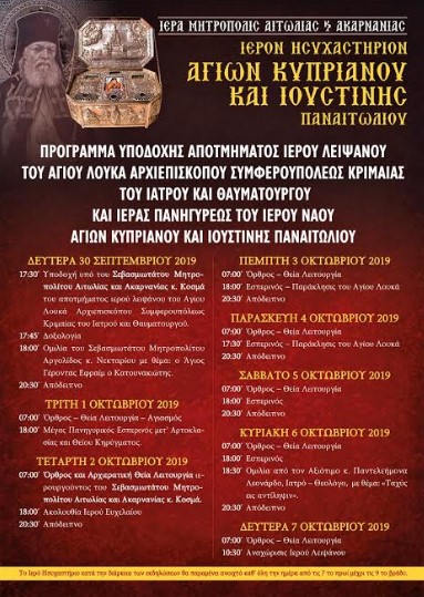 Την Τετάρτη 2 Οκτωβρίου 2019 η αγία μας Εκκλησία τιμά την μνήμη των Αγίων Κυπριανού και Ιουστίνης. Με αφορμή την ετήσια πανήγυρη του ομώνυμου Ιερού Ησυχαστηρίου που βρίσκεται στο Παναιτώλιο προγραμματίζεται η υποδοχή του αποτμήματος ιερού λειψάνου του Αγίου Λουκά Αρχιεπισκόπου Συμφερουπόλεως Κριμαίας του Ιατρού και Θαυματουργού, καθώς και άλλες λατρευτικές και πνευματικές εκδηλώσεις.