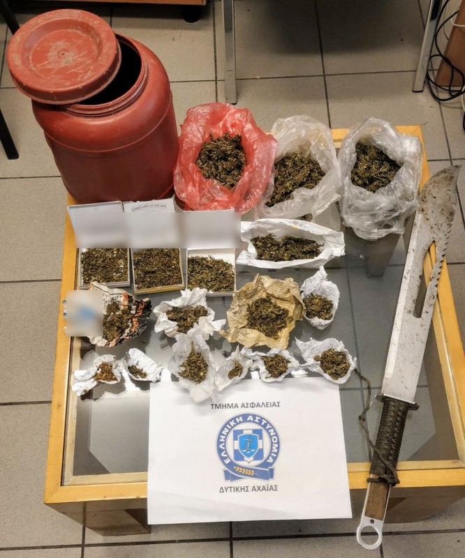 Ειδικότερα, οι αστυνομικοί του Τμήματος Ασφαλείας Δυτικής Αχαΐας, στο πλαίσιο αξιοποίησης πληροφοριών, πραγματοποίησαν έρευνα στην οικία του δράστη, κατά την οποία βρήκαν και κατέσχεσαν επτά συσκευασίες, με κάνναβη, συνολικού βάρους (23,3) γραμμαρίων και ένα ξίφος.