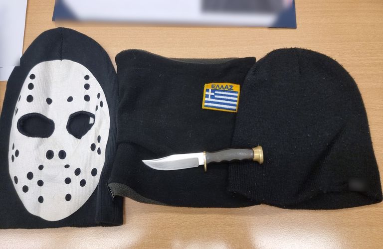 Σε σωματικό έλεγχο που ενήργησαν οι αστυνομικοί στους συλληφθέντες βρήκαν στην κατοχή του 16χρονου και κατέσχεσαν ένα μαχαίρι και μια κουκούλα τύπου full face, ενώ στη κατοχή του 17χρονου βρήκαν και κατέσχεσαν ένα σκούφο και ένα περιλαίμιο.