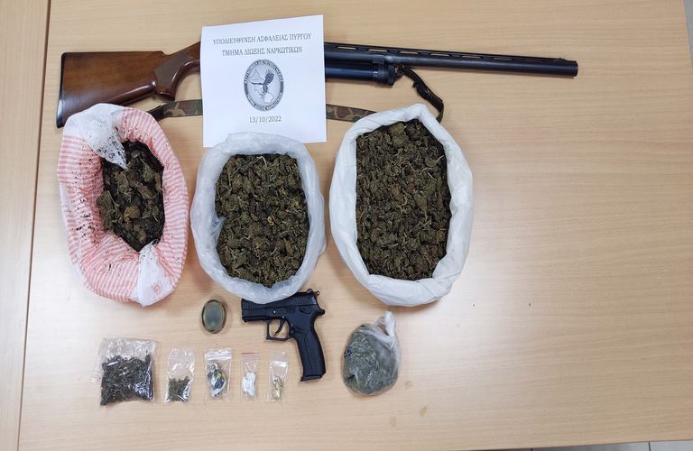Συνελήφθησαν δύο άτομα για διακίνηση ναρκωτικών στην Ηλεία – Κατασχέθηκαν περίπου (1.300) γραμμάρια κάνναβης, ένα πιστόλι και μια καραμπίνα.