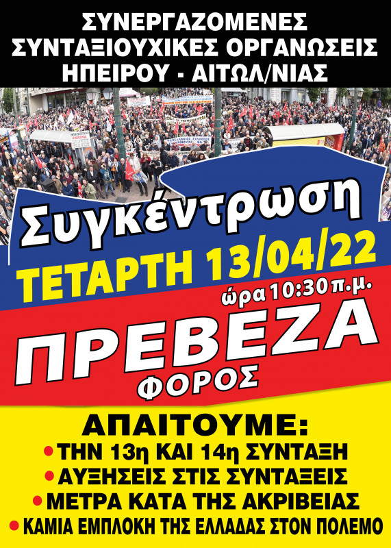 Καλούμε όλους τους συνταξιούχους του νομού Πρέβεζας να πάρουν μαζικά μέρος στο Πανσυνταξιουχικό συλλαλητήριο, στην Πρέβεζας στο Φόρο την Τέταρτη 13 Απρίλη 10:30 π.μ.