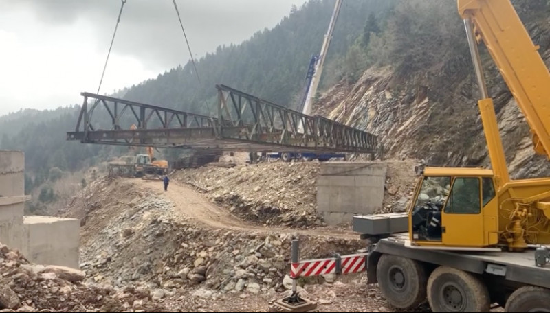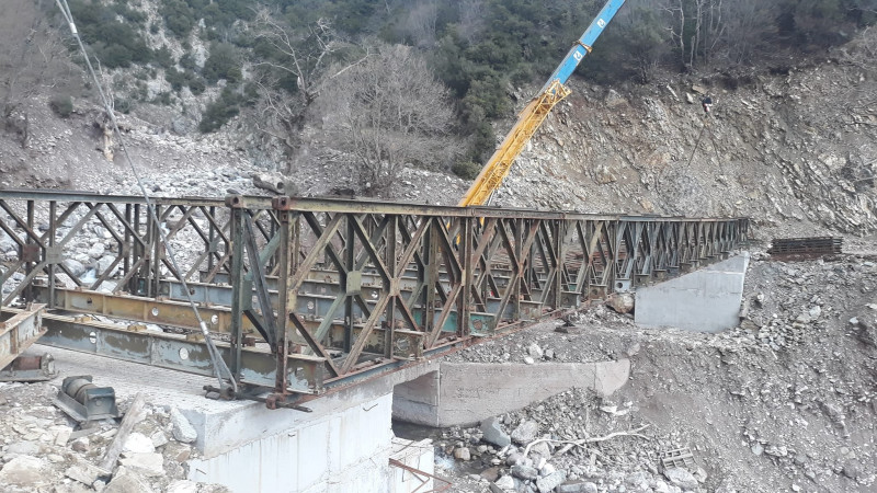 Από τη Δευτέρα 28 Μαρτίου ένα συνεργείο 15 ατόμων της ΜΟΜΚΑ και με τη βοήθεια προσωπικού του Δήμου Θέρμου εργάστηκε για τη συναρμολόγηση της στρατιωτικής γέφυρας μήκους 40 μέτρων και την τοποθέτησή της, με βοήθεια δυο γερανών, στα βάθρα που ήταν έτοιμα από το 2021.