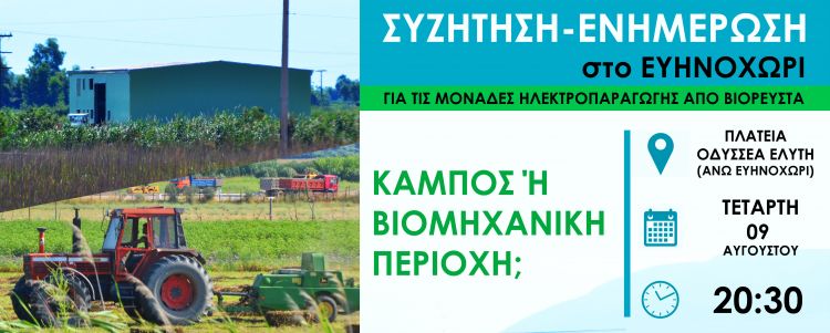 Συζήτηση/ενημέρωση για τα εργοστάσια βιορευστών στον κάμπο του Ευηνοχωρίου – Τετάρτη 9/8, 20:30 στην Πλατεία Ευηνοχωρίου