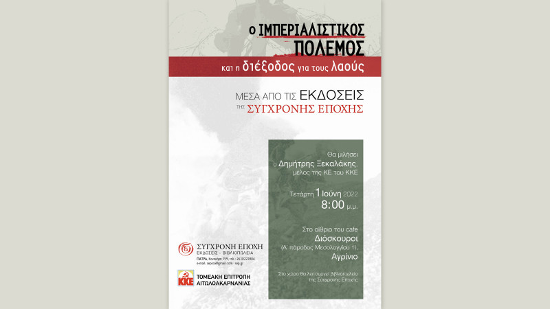 Εκδήλωση με θέμα «Ο ιμπεριαλιστικός πόλεμος και η διέξοδος για τους λαούς», μέσα από τις εκδόσεις της, θα προχωρήσει το εκδοτικό της Σύγχρονης Εποχής, από κοινού με την Τομεακή Επιτροπή Αιτωλοακαρνανίας.