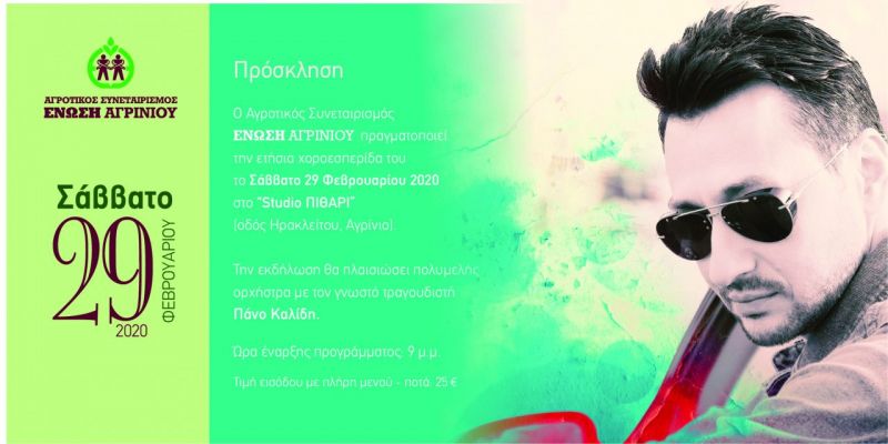Ο Αγροτικός Συνεταιρισμός ΕΝΩΣΗ ΑΓΡΙΝΙΟΥ πραγματοποιεί την ετήσια χοροεσπερίδα του το Σάββατο 29 Φεβρουαρίου 2020, στο εστιατόριο “studio Πιθάρι”, στην οδό Ηρακλείτου στο Αγρίνιο. Την εκδήλωση...