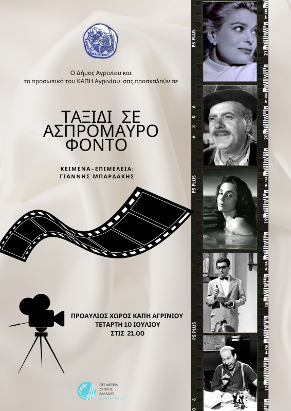 Η Διεύθυνση Προσχολικής Αγωγής, Προγραμμάτων, Παιδιού, ΑμεΑ και Τρίτης Ηλικίας, ο Δήμος Αγρινίου, το προσωπικό του Κ.Α.Π.Η. Αγρινίου και η Περιφέρεια Δυτικής Ελλάδας σας προσκαλούν την Τετάρτη, 10 Ιουλίου στις 21:00 σε μια νοσταλγική βραδιά κάτω από τα αστέρια, με θέμα τον Παλιό Ελληνικό Κινηματογράφο.