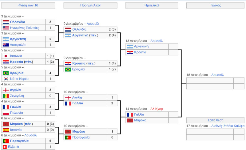 Με την μεγάλη πρόκριση της Γαλλίας κόντρα στη φιναλίστ του Euro 2020, Aγγλία, ολοκληρώθηκε η φάση των προημιτελικών του Παγκοσμίου Κυπέλλου του Κατάρ. Οι πρωταθλητές κόσμου πήραν το τέταρτο εισιτήριο των ημιτελικών και την Τετάρτη (14/12, 21:00) θα αναμετρηθούν με το Μαρόκο.