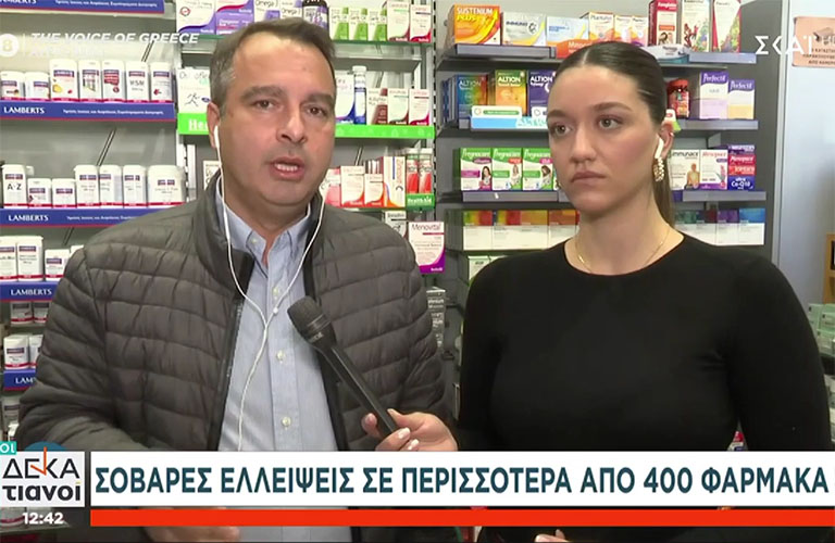 «Τα φαρμακεία θέλουμε να είμαστε μέρος της λύσης του προβλήματος των ελλείψεων των φαρμάκων» δήλωσε ο Θανάσης Παπαθανάσης Πρόεδρος του Φαρμακευτικού Συλλόγου Αιτωλοακαρνανίας και μέλος του ΔΣ του Πανελλήνιου Φαρμακευτικού Συλλόγου στην τηλεόραση του ΣΚΑΙ στην εκπομπή «Οι Δεκατιανοί» με τους δημοσιογράφους Γιάννη Πιτταρά και Γιώργο Γρηγοριάδη.