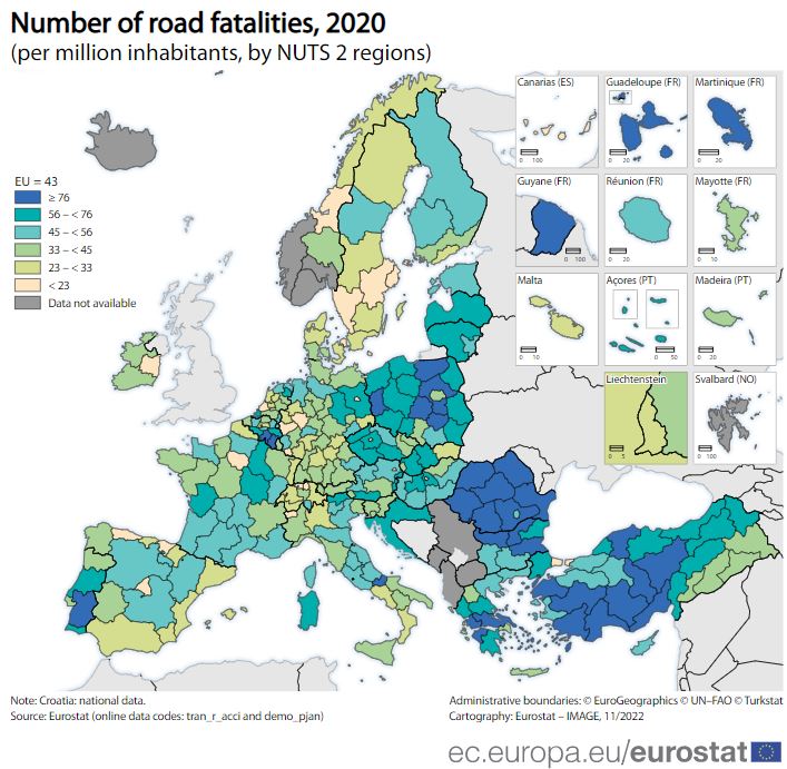 Τα δεδομένα δείχνουν ότι 112 από τις 239 περιφέρειες επιπέδου NUTS 2 κατέγραψαν συχνότητα θανάτων από τροχαία ατυχήματα κάτω από τον μέσο όρο της ΕΕ, ενώ 123 (ή το 51,5% όλων των περιφερειών) είχαν τιμή μεγαλύτερη. Υπήρχαν τέσσερις περιφέρειες που είχαν τον ίδιο αριθμό θανάτων από τροχαία ατυχήματα ανά εκατομμύριο κατοίκους με τον μέσο όρο της ΕΕ.
