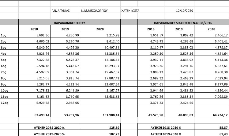 Ως προς τις παρακλινικές του Ν.4368/2016 (ανασφάλιστοι) για τα έτη 2018-2020 έχουμε αύξηση 55,87% και για τα έτη 2019-2020 έχουμε αύξηση 61,43%.