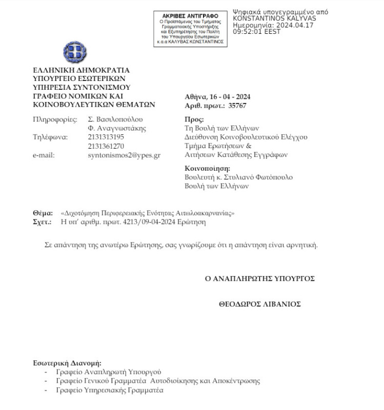 «Σε απάντηση της ανωτέρω Ερώτησης, σας γνωρίζουμε ότι η απάντηση είναι αρνητική», αρκέστηκε να ενημερώσει ο κος. Λιβάνιος.