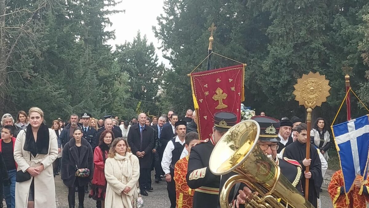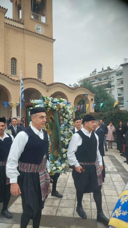 Είχε προηγηθεί λιτανευτική πομπή από τον Νέο Ιερό Ναό αφιερωμένη στον Πολιούχο του Αγρινίου με τη Φιλαρμονική να αποδίδει τιμές.