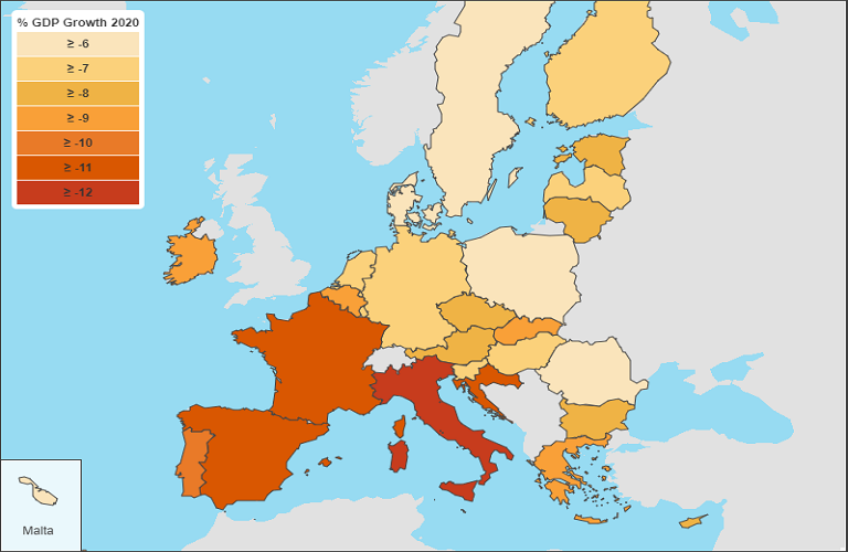 Η οικονομία της Ε.Ε. προβλέπεται να συρρικνωθεί κατά 8,3 % το 2020 και να σημειώσει θετικό ρυθμό ανάπτυξης 5,8 % το 2021.
