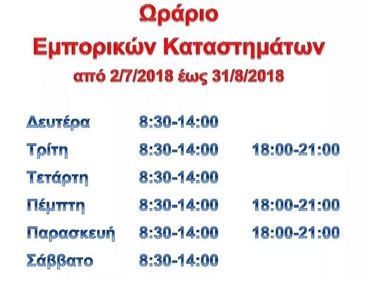 Ενημερωθείτε πρώτοι για το ωράριο των εμπορικών καταστημάτων της Ναυπάκτου που τέθηκε σε λειτουργία από την Δευτέρα, 02 Ιουλίου και θα διατηρηθεί ως έχει έως τις 31 Αυγούστου.