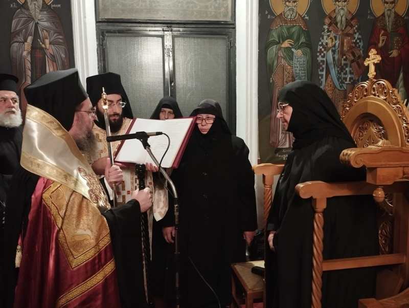 Αμέσως μετά ο Σεβασμιώτατος τέλεσε την Ακολουθία της Ενθρονίσεως της νέας Καθηγουμένης Γερόντισσας Χαριτίνης, που εξελέγη από την Αδελφότητα της Ιεράς Μονής στις 7 Μαΐου 2023, εις διαδοχήν της μακαριστής πρώτης Καθηγουμένης, Γερόντισσας Ευθυμίας Γκελτή.