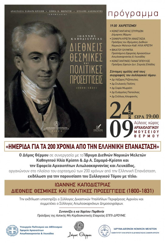 Μια εξέχουσα επιστημονική εκδήλωση σε συνδιοργάνωση με το «ΙΔΡΥΜΑ ΔΙΕΘΝΩΝ ΝΟΜΙΚΩΝ ΜΕΛΕΤΩΝ καθηγητού Ηλία Κρίσπη και Δρ. Α. Σαμαρά – Κρίσπη» και την ΕΦΟΡΕΙΑ ΑΡΧΑΙΟΤΗΤΩΝ Αιτωλοακαρνανίας και Λευκάδας θα πραγματοποιηθεί στις 24 Σεπτεμβρίου 2022, στον προαύλιο του του Αρχαιολογικού Μουσείου ΘΕΡΜΟΥ, με θέμα: «ΙΩΑΝΝΗΣ ΚΑΠΟΔΙΣΤΡΙΑΣ, Διεθνείς θεσμικές και Πολιτικές προσεγγίσεις (1800-1831)».