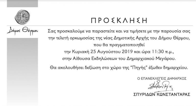 Σας προσκαλούμε να παραστείτε και να τιμήσετε με την παρουσία σας την τελετή ορκωμοσίας της Νέας Δημοτικής Αρχής του Δήμου Θέρμου που θα πραγματοποιηθεί την Κυριακή 25 Αυγούστου 2019 και ώρα 11:30 π.μ., στην αίθουσα εκδηλώσεων του Δημαρχιακού Μεγάρου.